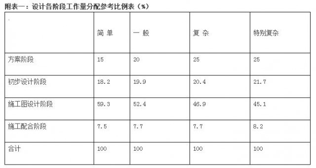 定額》(住房和城鄉(xiāng)建設(shè)部頒發(fā)),詳見(jiàn)附表一《設(shè)計(jì)各階段工作量分配參考比例表》。