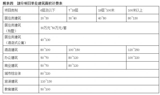 部分項(xiàng)目可采用單位建筑面積方式計(jì)費(fèi),詳見(jiàn)附表四《部分項(xiàng)目單位建筑面積計(jì)費(fèi)表》