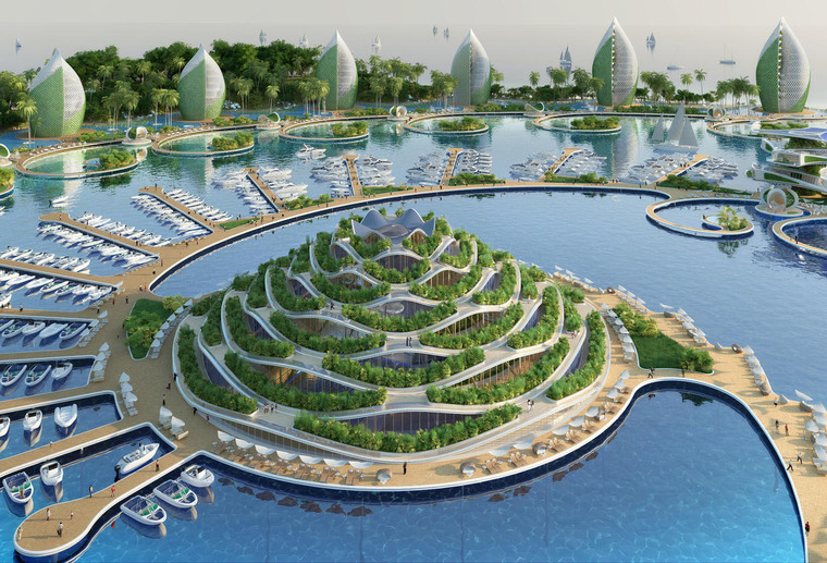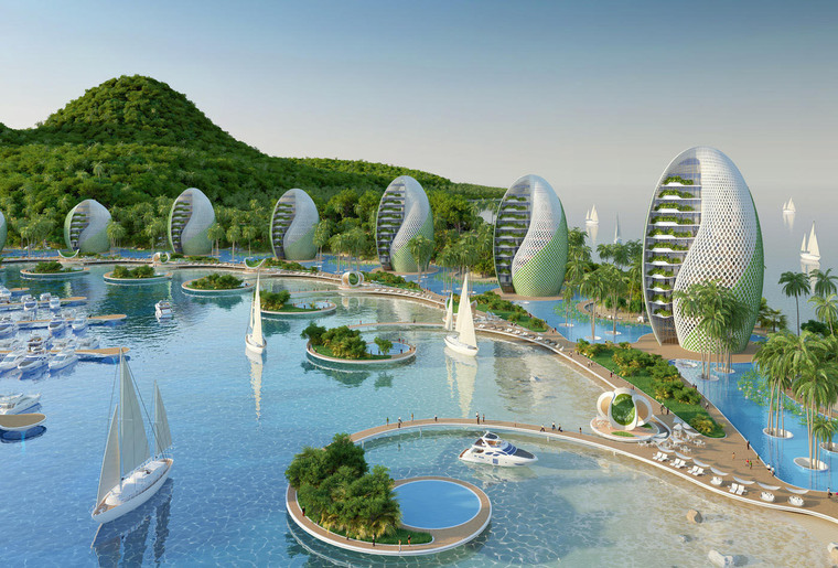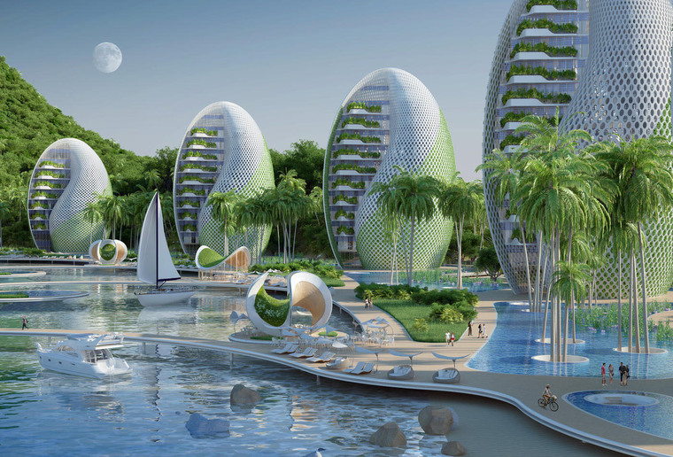 度假村廣泛使用“從源頭到源頭”的再利用方略和其他可持續設計策略,將本次方案設計成一系列螺旋形式的公寓樓和貝殼狀的旅館建筑,并將這些建筑按照兩條斐波納契螺線的旋轉軌跡排布于沿海環礁湖的岸邊。建筑群的中心是一座山形的綜合體,里面設置有學校、休閑游泳池、體育大廳、供度假村使用的廚房以及供環境科學家使用的整套實驗室用房。本次方案起名為“鸚鵡螺生態度假村”,生態設計是本次項目的主要側重點,Vincent Callebaut事務所精準地指出對菲律賓群島構成的環境威脅并以此作為設計靈感。方案中運用了各種各樣的可再生能源,包括潮汐能與太陽能,如果這些自產的能源在使用后還有結余,便會連接到地方電網并提供給社區。