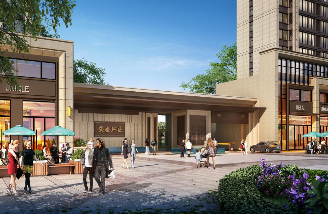 本案采用現(xiàn)代建筑風格,以具有濃厚地域特色的傳統(tǒng)文化為根基,融入西方文化,把亞洲元素植入到現(xiàn)代建筑語系,將傳統(tǒng)意境和現(xiàn)代風格對稱運用,用現(xiàn)代設(shè)計來隱喻中國傳統(tǒng)。結(jié)合周邊建筑的特點,設(shè)計為整體稍偏暖色調(diào),外立面采用米黃色真石漆,沒有復雜體量的堆砌,只是在簡單的體量上憑借精致構(gòu)件加以點綴。強調(diào)面的實體作用和玻璃的虛化作用,形成對比。商業(yè)體塊感更強一些,在心理感受上既給予人們質(zhì)樸、親切的感受,又結(jié)合了現(xiàn)代建筑潔凈簡單的特點。